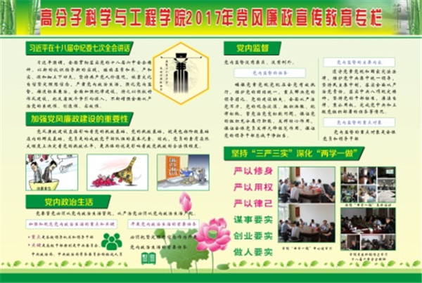 4月7日党委中心组以十八届六中全会精神、“两会”会议精神、习近平同志在全国高校思想政治工作会上的讲话精神、教育系统党风廉政建设工作视频会议精神和学校2017年党风廉政建设工作会议精神为主要内容,并就《关于新形势下党内政治生活的若干准则》进行了专题学习。4月15日在江安校区举办了第十一届“高工铸梦,材蕴匠心”PSE活动月开幕式暨师生趣味运动会