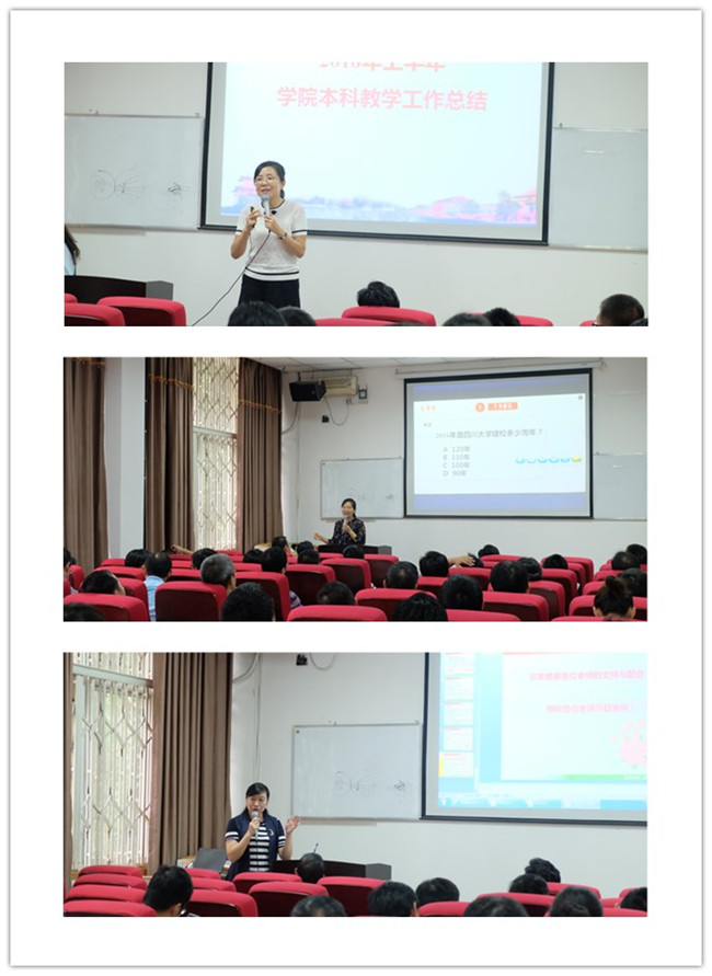 教学副院长冉蓉对9月中旬的本科教学评估进行了动员,并邀请我校现代教育技术中心工作人员对手机互动教室的使用作了相关培训。冉院长强调,全院教职工应高度重视本次教学评估,做好充分准备迎接专家进校,达成以评促建、以评促改的目的。李艳梅副院长强调了安全环保相关事宜,并对具体分管工作作了通报与部署。