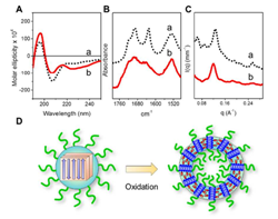 在前期工作基础上,本研究论文进一步提出通过二级构象调控高分子自组装形貌和实现功能开关的新思想(J. Am. Chem. Soc., DOI: 10.1021/jacs.8b01873)。为了实现该思想,该研究团队设计并合成一种胆固醇修饰的聚乙二醇-聚半胱氨酸嵌段共聚物,该共聚物能通过ROS刺激触发聚合物二级结构从β折叠向α螺旋转变,并驱动其自组装结构由胶束向囊泡转变。论文通过透射电镜、光散射、荧光探针等手段证实了形貌转变过程,并利用圆二色谱、傅里叶变换红外光谱、小角X射线散射和二维核磁等方法表征自组装体的高级结构,阐明了二级构象驱动自组装形貌转变的机理(图1)。