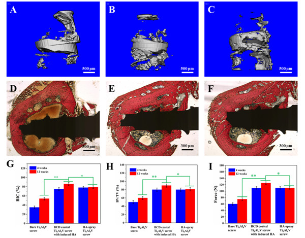 图4.植入12周后,具有该涂层的骨螺钉展现了良好的界面骨诱导和骨整合能力