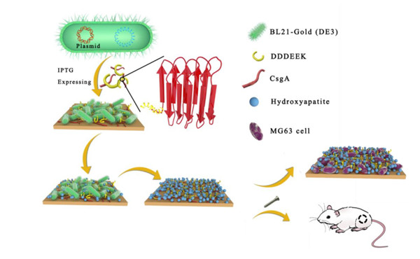 图1.CsgA-DDDEEK涂层材料的制备与诱导生物矿化层示意图