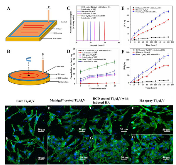 图3.CsgA-DDDEEK能够诱导具有强界面附着力的生物矿化涂层,并粘附细胞