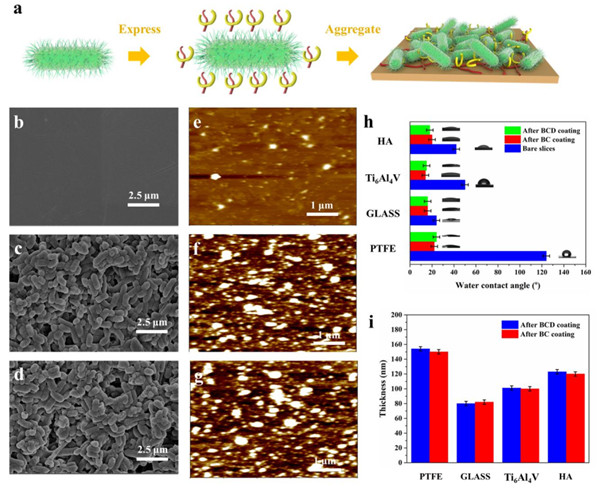 图2.CsgA-DDDEEK能普适性黏附在金属、无机和聚合物材料表面