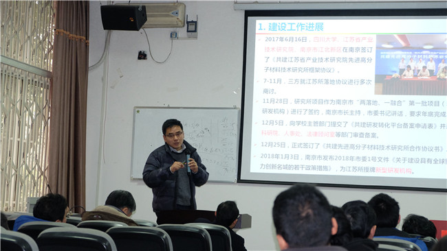 8bo8足球比分 党委书记牟德富书记代表8bo8足球比分 领导班子作2017年工作总结。他从一流学科建设、学生培养、科学研究、师资队伍、实验室管理等方面进行了总结汇报,并介绍了各方面的目标任务完成情况。牟书记指出,今年王琪教授成功增选为中国工程院院士,高端外籍教师Coates教授获得中华人民共和国国际科学技术合作奖,基金委创新群体成为国内高分子领域首个、川大首个六进九创新群体项目等捷报频传,对我校高分子人才建设和学科建设起到了极大的推动作用。接着,牟书记对2017-2021年度基层单位领导班子任期考核目标进行了解读,并对2018年的主要工作做了相关安排。