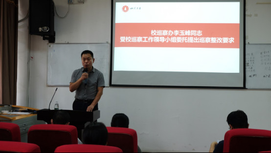 李玉峰同志受学校党委巡察工作领导小组委托,对巡察整改工作提出要求。强调要提高政治站位,深刻认识巡察整改的重大意义;制定切实可行整改方案,不折不扣抓好巡察整改;落实整改责任,建立长效机制,确保巡察整改取得实效。