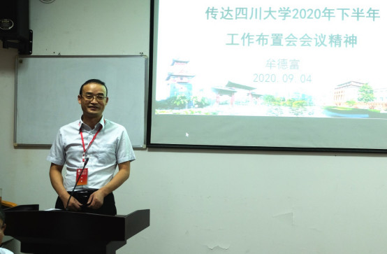 冯玉军副所长代表高分子研究所作工作报告。他总结了2020年研究所的科技工作概况,对比了2018-2020年“双一流”建设目标任务和2020年目标任务及重要指标的完成情况,分析了2020年高研所发展面临的新形势及科研核心指标,并对学校新学期工作布置会内容及政策进行了详细解读,希望全体教职工在重视实验室安全环保工作的同时继续奋战2020年,推动高研所的进一步发展,助力世界一流学科建设(一期)圆满收官。