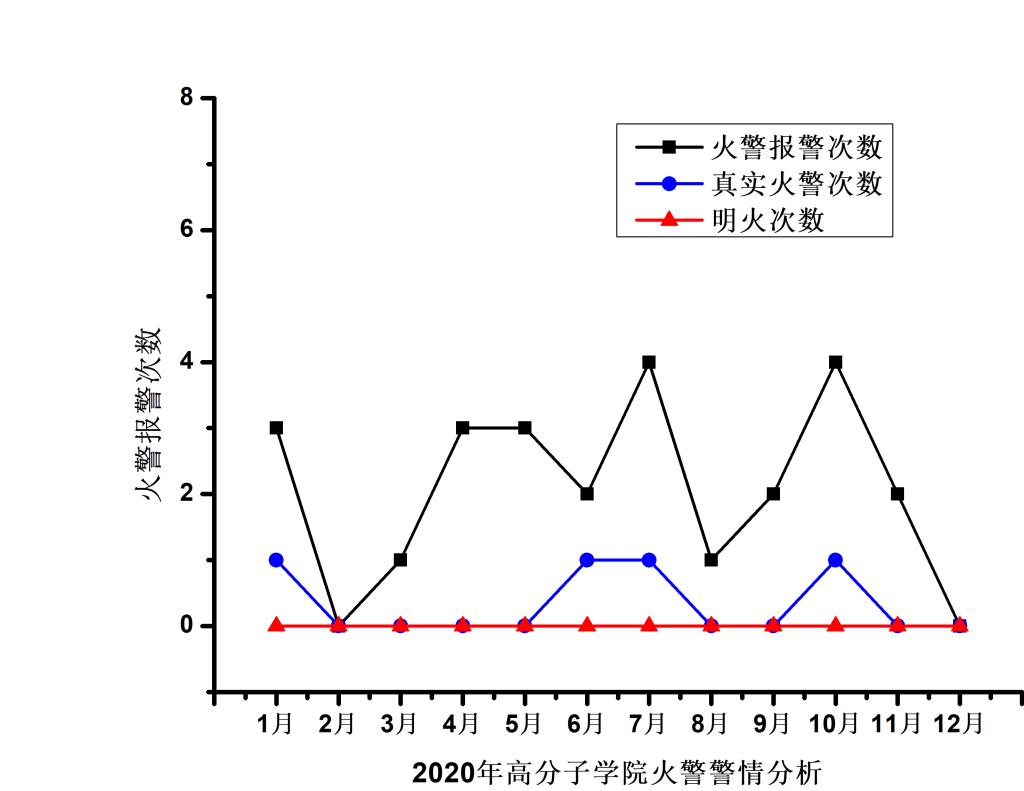 烟感报警系统已运行两年,与2019年相比较,2020年火警报警次数、真实火警次数均有了大幅度下降,实验室发生明火火情的次数归零(图3)。值得注意的是,今年4次火情有3次发生在寒暑假放假之前,假期来临之前学生容易放松,注意力不集中,各课题组务必吸取经验教训,寒假来临前加强实验室管理,杜绝一切安全事故的发生。
