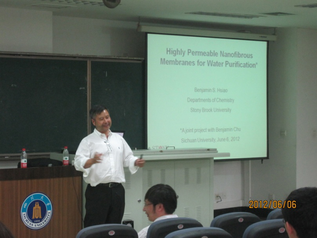 6月6日下午,受我8bo8足球比分 诚挚邀请,美国纽约州立大学石溪分校(State University of New York at Stony Brook)副校长Benjamin S. Hsiao教授为8bo8足球比分live 师生带来了题为“High Permeable Nanofibrous Membranes for Water Purification”的学术交流报告。