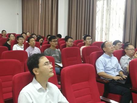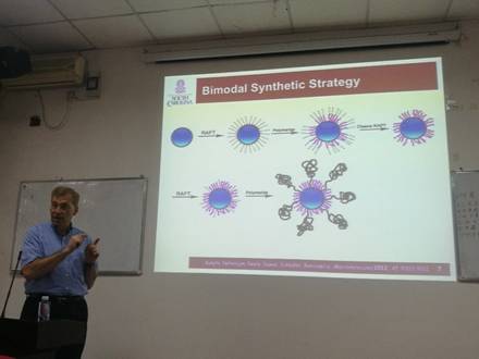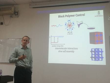唐传兵教授做了题为“Metallo-Polyelectrolytes: Chemistry, Self -Assembly and Materials”的专题报道,重点介绍了含Co、Fe等金属复合的聚电解质材料的性能和结构设计思路。通过带正电性的金属离子与含阴离子基团的药物发生相互作用增强了药物的作用效果,在材料形态控制和抗菌性能等方面都表现出独特的性质。Brian C. Benicewicz教授做了题为“Polymer Grafted Nanoparticles for Interface Design, Controlled Ordering and Nanocomposite Properties”的专题报道,重点介绍了采用RAFT聚合控制纳米粒子接枝多种不同组成成分的高分子,通过控制接枝密度、分子量、化学成分等,从而控制纳米粒子表面性质和形态。Morgan Stefik教授做了题为“Kinetic Control of Micelle Templates”的专题报道,重点介绍了利用胶束模板法控制孔径大小和聚合物孔壁厚度的研究成果。该工作利用水来控制聚合反应的动力学,实现了具有相同孔径大小不同孔壁厚度的高分子多孔材料的可控制备。参会的老师和同学们还同三位教授进行了热烈的讨论,并向教授们请教了“金属复合的聚电解质材料的结构稳定性”、“纳米材料表面基团间相互作用”和“自组装工艺”等问题。