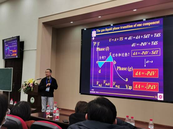 吴奇院士结合《热力学简明教程》,向大家介绍了一些基本概念,如温度、压强、理想气体、渗透压、过热现象等,在不涉及复杂数学计算的前提下,形象生动地阐述了热力学原理及应用之间的关系。同时,吴奇院士就实际教学中存在的一些问题发表了自己的观点,强调了热力学教学过程中应当侧重热力学概念及原理讲解,培养学生的逻辑思维。报告最后部分老师和同学向吴奇院士提出了问题,吴奇院士一一作出了耐心解答和指导。报告过程中吴奇院士与在座师生幽默互动,氛围轻松愉快。本次报告让老师和同学们对热力学原理有了更加深刻的了解,也启发了老师和同学们对于自身教学、科研、学习的思路。