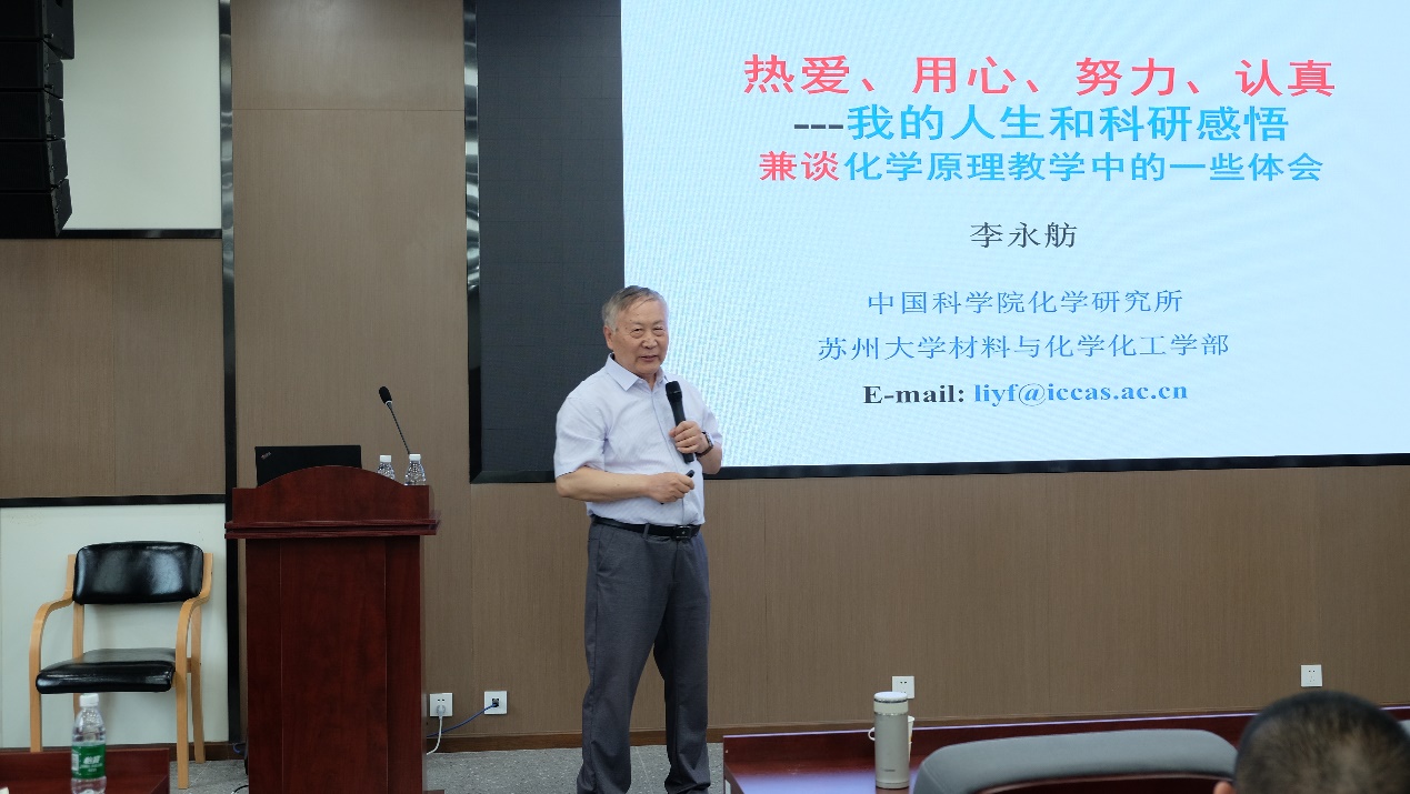 李永舫院士从他的人生轨迹出发,分享了对人生及科研的感悟和从其个人经历中总结出“热爱、用心、努力、认真”的八字箴言。李院士从“人生感悟:人生苦乐相伴”、“努力:天道酬勤”、“认真:为人“待人以诚”、做事“一丝不苟”等几个方面,分享了自己这些年在生活、教学、科研等方面的经验,李院士强调机会总是青睐有准备的人,有实力才会有机会,而实力需要我们平时的努力来铸就。最后,李院士分享了他为中国科8bo8足球比分 大学本科生讲授《化学原理》课程过程中的体会,在授课过程中向同学灌输“热爱、用心、努力、认真”的八字箴言和人生信念,并将最新研究成果和最新工业生产现状融入教学中,引导他们真正地热爱化学。