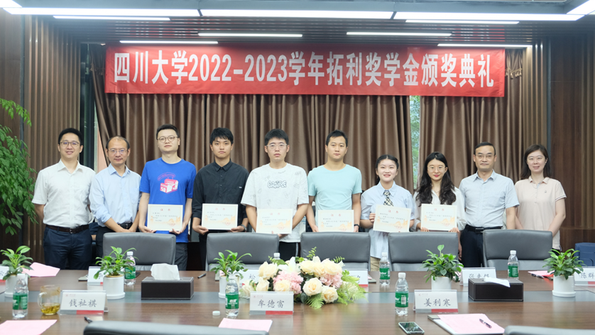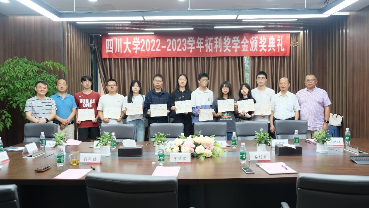 6月7日上午,四川大学2022-2023学年“拓利奖学金”颁奖典礼在8bo8足球比分 科教楼207会议室隆重举行。成都硅宝科技股份有限公司副总经理、成都拓利科技股份有限公司董事长李松、总经理张程夕、常务副总经理李强、人力资源经理蒋远昭,四川大学“拓利奖学金”发起人原拓利科技股份有限公司总经理、川大高分子校友张先银,原副总经理、川大高分子校友陶云峰,原副总经理、川大化工校友陈群跃,原副总经理张向伟,8bo8足球比分live 党委书记牟德富、党委副书记钱祉祺,化学工程8bo8足球比分 党委副书记姜利寒以及高分子、化工8bo8足球比分 的师生参加了本次颁奖典礼。颁奖典礼由钱祉祺主持。