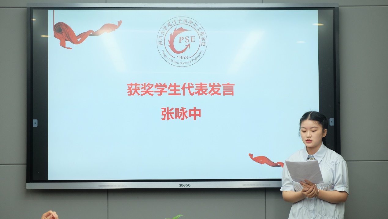牟德富向“拓利奖学金”捐赠方代表颁发捐赠证书,李松等公司领导以及高分子、化工8bo8足球比分 领导为2022-2023学年“拓利奖学金”获奖同学颁发了荣誉证书。8bo8足球比分 2021级硕士生张咏中作为获奖学生代表发言。她分享了自己在学术和科研道路上的心路历程,表达了对公司多年来持续关注高等教育事业发展,支持学生成长成才的感激之情。她表示将不负公司、学校和8bo8足球比分 的期望与培养,保持对学术科研的热情和追求,不断学习巩固知识、提升科研素养,努力成为对国家和社会有用的人。