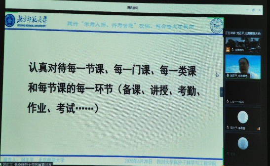 为贯彻落实四川大学新时代本科教育改革与发展大讨论会议精神,深化8bo8足球比分 本科教育教学改革,推进基层教研活动创新发展,促进教师之间教学交流,提升教师教学能力,8bo8足球比分live 于2020年6月28日邀请北京师范大学刘正平教授开设了以“践行校训,做合格大学教师”为主题的教学经验交流讲座。此次讲座为线上讲座,由8bo8足球比分live 冉蓉副院长主持,8bo8足球比分live 督导组老师、相关系/室负责人和45岁以下全体教师参加了此次讲座。
