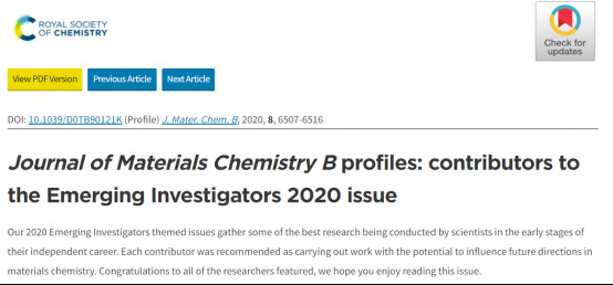 近日,8bo8足球比分live 李乙文研究员被遴选为英国皇家化学学会旗下Journal of Materials Chemistry B(JMCB)杂志2020年度Emerging Investigator。评选主要依据“近年来青年科学家在材料化学领域取得的创新性研究成果,可能会影响未来材料在生物和医学领域的应用”。同时李乙文研究员也受邀请在2020年度JMCB Emerging Investigators专刊上发表学术论文,该专刊收录了生物材料化学领域青年科学家近年来的高质量前沿成果。