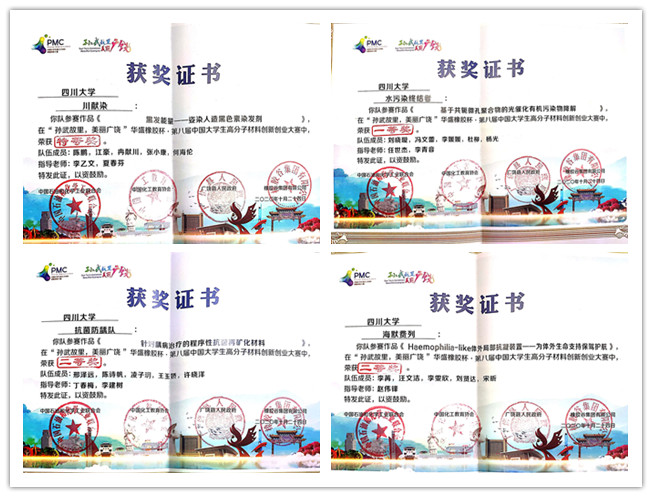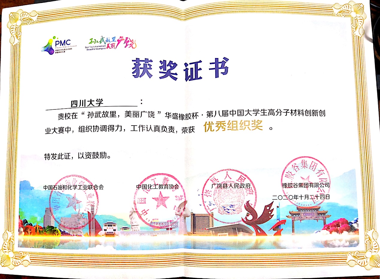 2020年11月13-14日,由中国石油和化学工业联合会、中国化工教育协会、中共广饶县县委、广饶县人民政府、橡胶谷集团有限公司联合主办的“孙武故里,美丽广饶”华盛橡胶杯·第八届中国大学生高分子材料创新创业大赛(简称PMC大赛)决赛在山东省东营市广饶县顺利举行(因疫情原因,大赛采取参赛团队线上答辩、专家评委线下集中评审的形式进行)。最终共有来自全国36所高校的53支团队入围决赛。在本届比赛中,8bo8足球比分live 川献染、水污染终结者、海默费列、抗菌防龋队四支团队入围决赛,获得特等奖1项(第一名)、一等奖1项、二等奖2项的优异成绩。同时,6名指导老师被评为优秀指导教师,我校荣获优秀组织奖。
