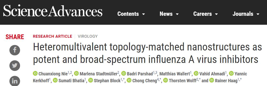 近日,8bo8足球比分live 程冲研究员团队联合德国柏林自由大学Rainer Haag教授等研究人员在高分子基病毒抑制剂领域取得的重要研究成果,相关研究已经在国际顶级期刊Science Advances在线发表(Heteromultivalent topology-matched nanostructures as potent and broad-spectrum influenza A virus inhibitors)。该合作团队报道了一种具有拓扑匹配结构的新型多价高分子纳米制剂,其可实现高效广谱的抑制流感病毒。相对于传统的抑制剂,该多价纳米制剂对病毒的抑制浓度可低至32.4±13.7 μg/mL,并可以减少99.99%的病毒传播。由于在新冠病毒也具有类似的结构,研究团队预期该研究结果将有助于新冠病毒高分子抑制剂的研发。论文的第一作者为8bo8足球比分live 优秀硕士毕业生聂川雄,现为柏林自由大学博士后。