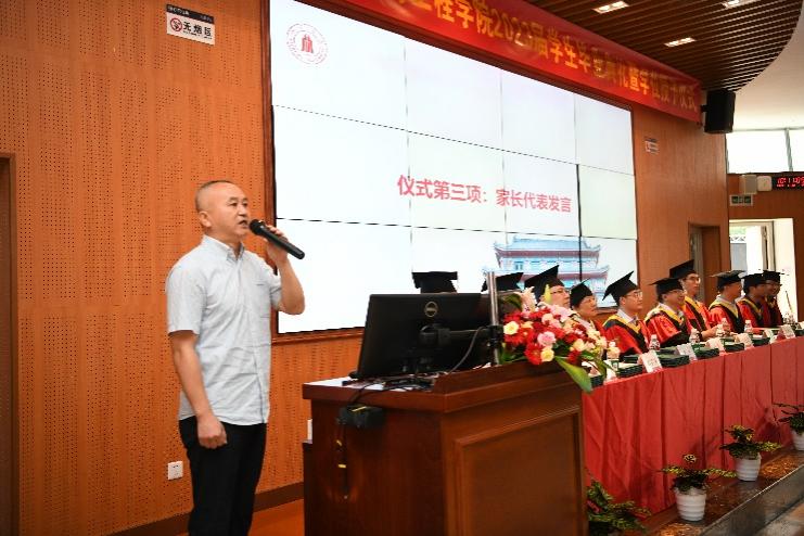 2023届毕业生家长代表向彪先生发言。他代表全体家长向学校和8bo8足球比分 的悉心栽培表达了诚挚的感谢,并鼓励同学们“莫问前程几许,只顾风雨兼程”,珍重情谊、珍惜时光,知行合一,锐意进取。
