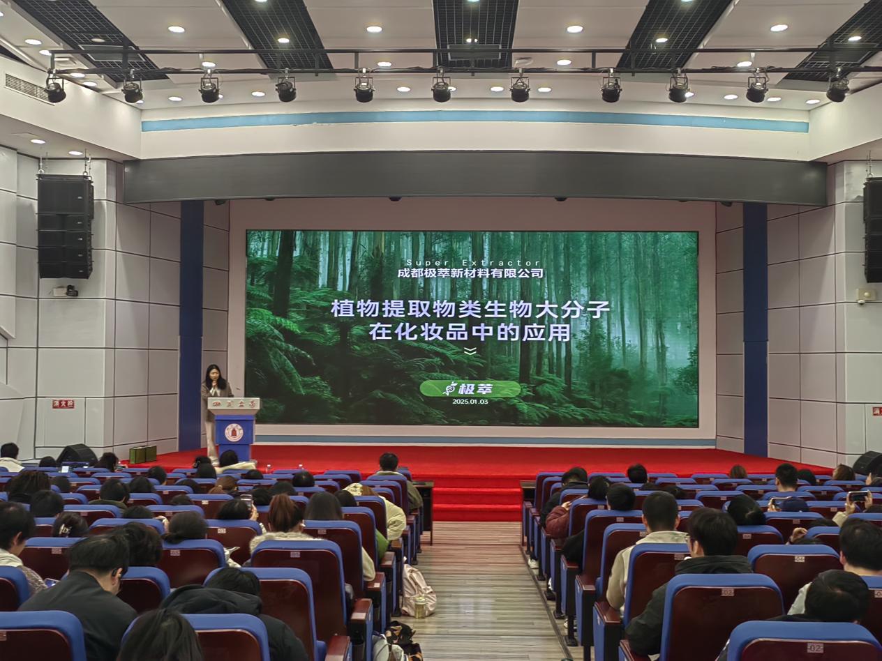 成都极萃新材料有限公司的王玫郦总监则以“植物提取物类生物大分子在化妆品中的应用”为主题进行分享。她首先介绍了植物提取物类生物大分子在化妆品市场的火热现状,受消费者追求健康环保意识和国家政策支持的影响,市场规模增长迅速。在此基础上,王总监指出植物提取物在应用中面临提取纯化技术瓶颈、机制研究不足、安全性与过敏性风险、可持续性环保压力等挑战,同时也提出了相关技术发展方向,如高效提取分离技术突破、功效机制深入研究等。