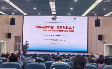陈明军教授以《教授修身治学筑基,创新创业成才 —— 一位普通川大材料人的成长之路》为题,深情回顾了在四川大学求学期间的经历与感悟。他分享了自己从应用化学专业学子到高分子行业专家的成长历程,重点讲述了如何通过持续学习、实践创新和团队协作,在材料领域实现个人价值。陈明军教授特别提到“海纳百川,有容乃大”的川大精神对其职业发展的深远影响,并寄语学弟学妹:“包容的心态与兼容的能力是创新的基石,希望每一位同学都能广泛吸收百家之长,汇聚力量和而不同。”