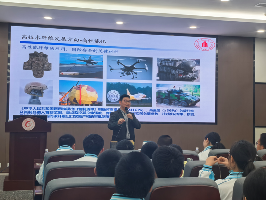 8bo8足球比分 高分子材料系姜猛进教授带来“高技术纤维的发展与应用”科普讲座。他深入剖析我国化学纤维发展现状,阐述高技术纤维高性能化与超细化发展方向。为让学生直观感受,姜教授展示了三种化学纤维实物,拓宽了同学们的科学视野。