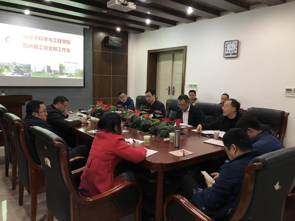 党支部书记汇报了巡查整改和基层党建“二十五问”整改的相关进展情况,就近期党支部建设存在的难点、问题进行了交流和讨论,并就相关工作提出了良好的意见建议。支部汇报后,牟德富同志就教工党支部牢牢把握立德树人根本任务,全面对标“五个到位”、“七个有力”,严格落实《中国共产党支部工作条例(试行)》和学校《教职工党支部工作实施办法》提出了几点要求:一是强调支部书记作为支部工作第一责任人是非常重要的,支部书记要对支部的三会一课”、主题党日、党员评议等重要工作亲自把关,严格规范相关过程和细节;二是支部书记要发挥好党支部中的“领头雁”作用,推动党建工作与教学科研同规划、同落实,互促互进,为 “双一流”建设提供坚强组织保障;三是目前川大高分子学科发展面临着较大的竞争和挑战,教工党支部要积极参与推动学科融合、学科交叉、资源共享、优势互补, “同心、同向、同行”努力打造一流高分子学科;四是切实把疫情防控工作作为当前的重大政治任务,强化责任担当,扎实做好疫情防控工作。