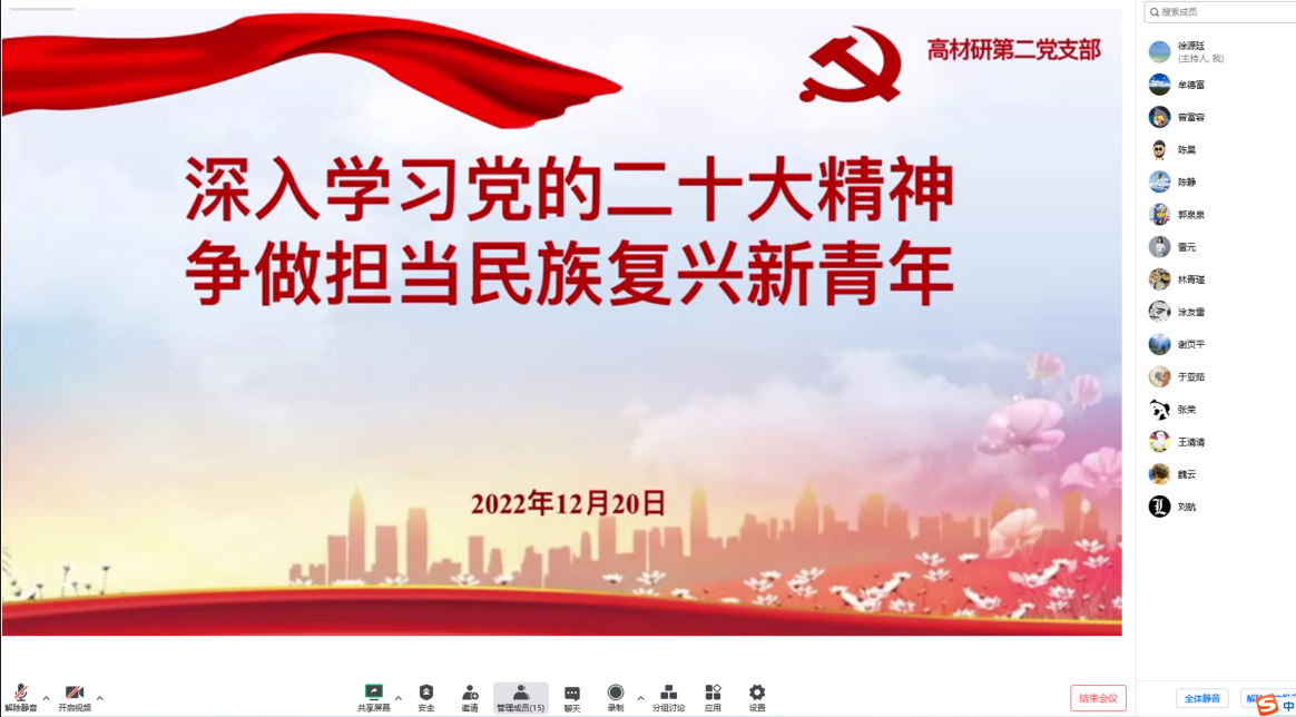 本次组织生活由支部的雷元和 谢页平 同志分享了他们前段时间学习二十大精神的心得体会。 雷元 同志 以 “ 深入学习党的二十大精神,争做担当民族复兴新青年 ” 为主题,首先带 着 大家深刻领会二十大主题以及三个号召:务必不 忘初心,牢记使命,务必谦虚谨慎,艰苦奋斗,务必敢于斗争,善于斗争。然后 她 分享了二十大的主要成果、过去五年经历的重大挑战和考验,总结了二十大提出的三大事件、历史性成就、四个里程碑,以及中国式现代化的特点 和 本质要求、实现全面建成社会主义现代化强国的总战略安排等 , 最后鼓励大家 一起 立足 于 本职 的学习和科研 工作,做有责任有担当的新时代好青年。
