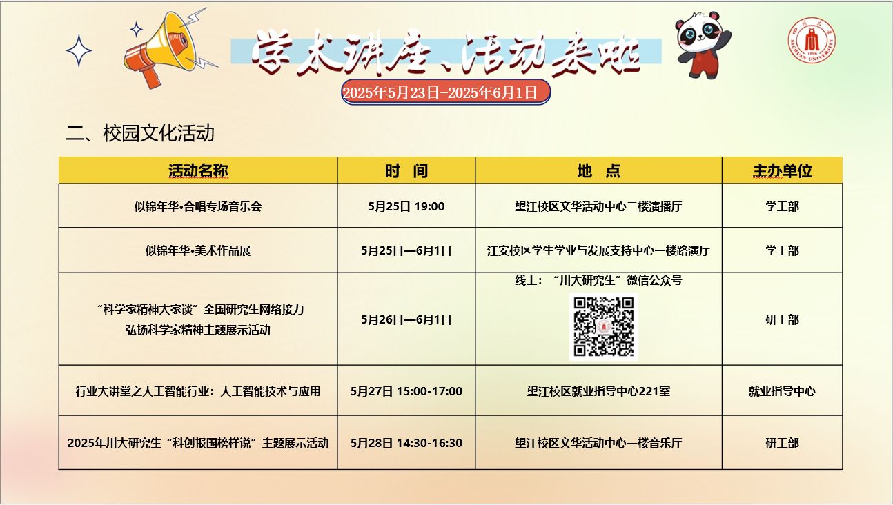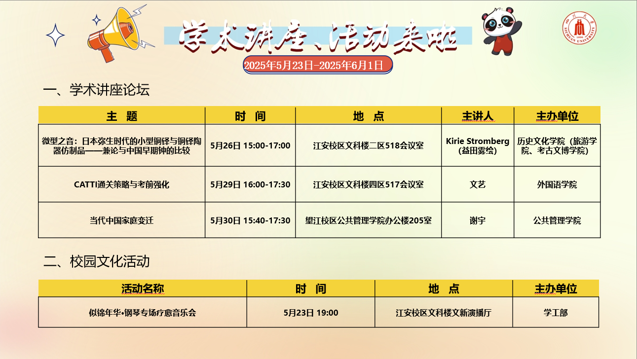 学术讲座论坛及校园文化活动预告(2025年5月19日-2025年5月25日)