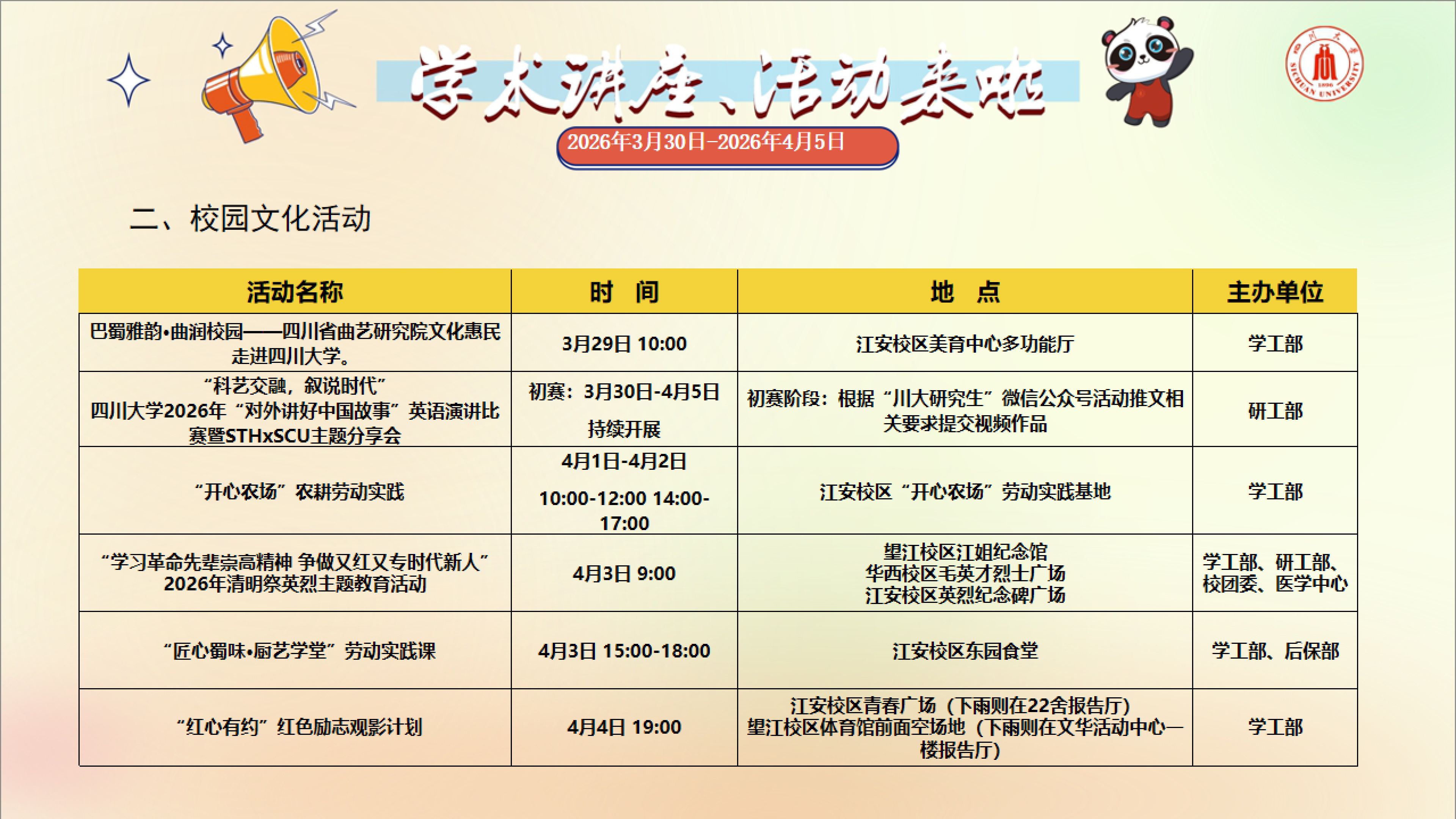 学术讲座与校园文化活动预告(2026年3月30日-2026年4月5日)