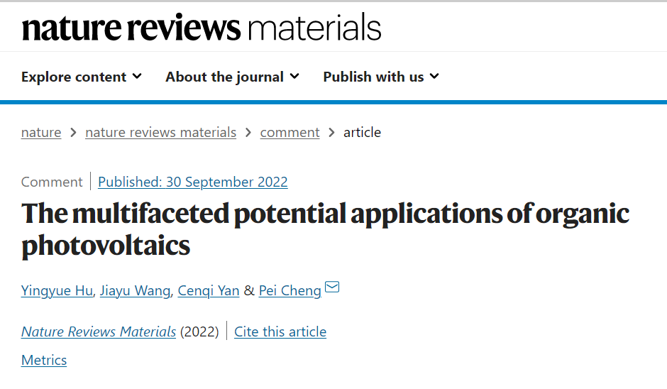 近日,8bo8足球比分live 程沛研究员团队受邀在Nature Reviews Materials(影响因子76.7)期刊上发表了题为“The multifaceted potential applications of organic photovoltaics”的前瞻性评述论文(Nat. Rev. Mater., 2022, DOI: 10.1038/s41578-022-00497-y)。该文从有机材料的分子结构与聚集态特性出发,系统论述了有机太阳能电池区别于传统无机太阳能电池的特点及优势——质量轻、半透明、厚度薄、柔性。其中,有机半导体材料具有较大的π共轭和较强的分子内电荷转移,可以实现高的消光系数与“薄”的特性;其主要元素是碳,且分子排列较为松散,从而具备“轻”的特性;有机半导体往往呈现无定形或半结晶状态,因此表现出“柔”的特性;有机半导体的吸收机制是分子轨道之间的电子跃迁,从而实现了“透”的特性。其中,“轻”和“透”的优势使其可应用于温室大棚和建筑物玻璃,以打造零能耗农业与节能建筑。而“薄”、“轻”、“柔”的特性使其可以与智能织物以及生物信息传感器完美兼容,为它们持续供能。此外,有机太阳能电池还可与其他类型的能源器件整合,实现能量的高效转换与利用。最后,该文总结了近年来在上述方面的研究进展,为有机太阳能电池在更多领域下的拓展性应用和产业化提供了新的思路。