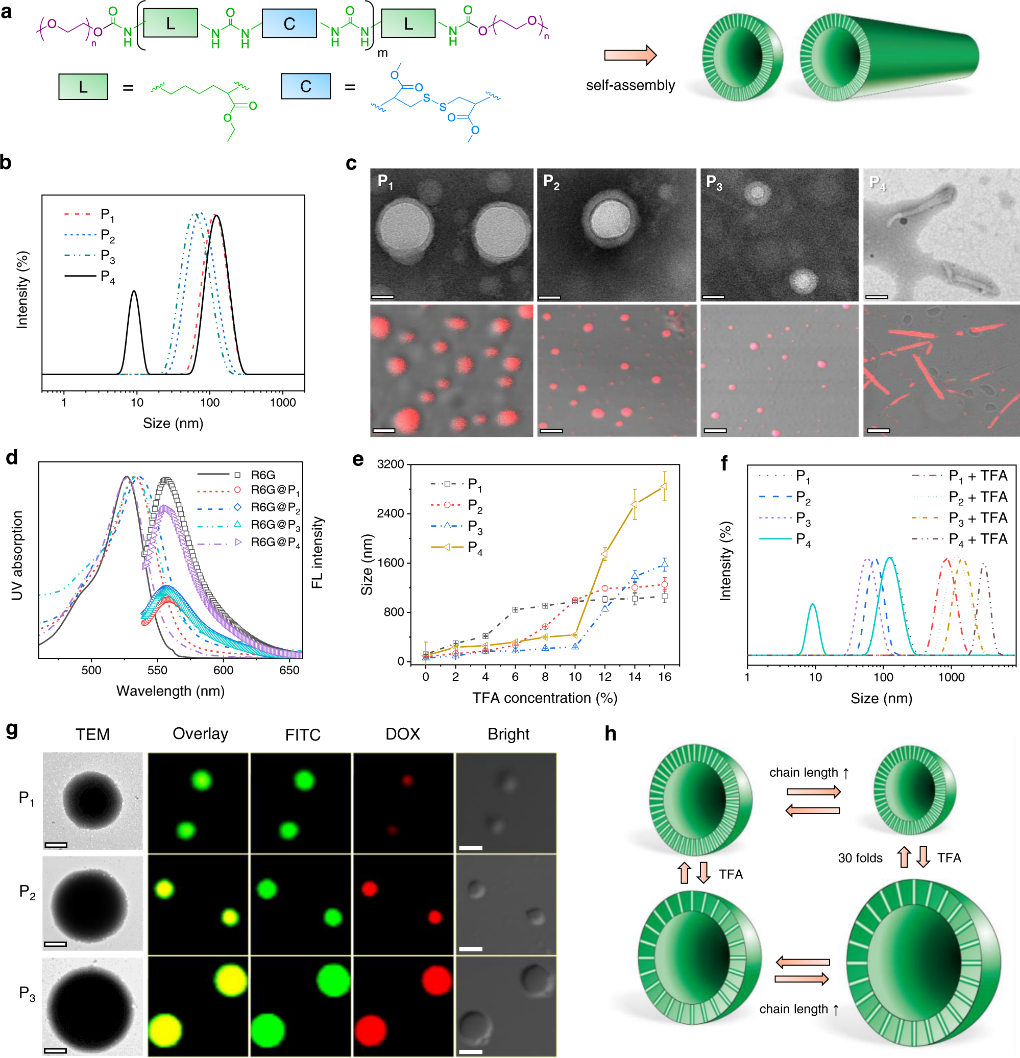 作者首先设计并合成系列不同链段数的两亲性聚脲基酸酯(P1-P4)。通过动态光散射(DLS)、透射电镜(TEM)、激光共聚焦显微镜(CLSM)等表征手段证实聚合物自组装形成囊泡和纳米管结构,并且发现由于密集的氢键,其粒径随着链段数的增加而减小。通过加入和去除TFA操纵氢键相互作用,囊泡的超大可逆“呼吸”现象成为了现实,其中囊泡尺寸可以在5-30倍的范围内可逆变化(图1)。