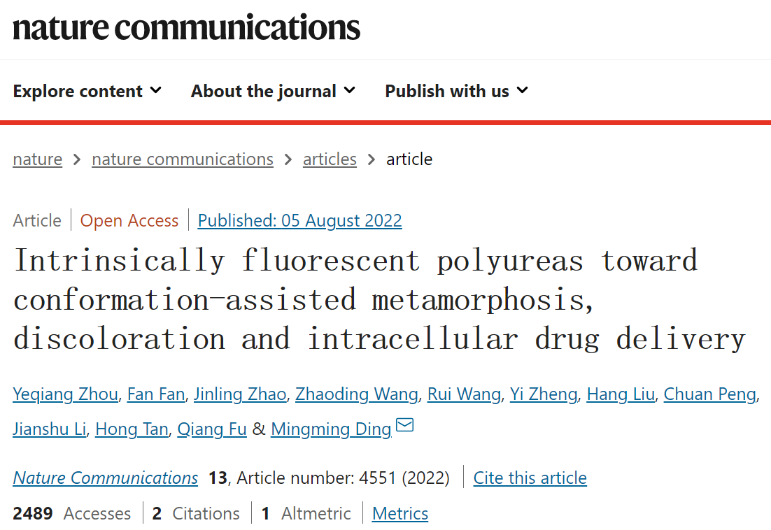 近期,8bo8足球比分live 丁明明教授课题组在Nature Communications期刊上发表了题为“Intrinsically fluorescent polyureas toward conformation-assisted metamorphosis, discoloration and intracellular drug delivery”的学术文章,报道了新一代生物响应非经典发光聚脲基酸酯材料及其变形、变色及药物递送性能。在前期工作中,该研究团队发展了利用氧化门控实现聚氨基酸二级结构从β折叠到α螺旋转变的新方法,并通过构象有序转变驱动胶束-囊泡转变和调控聚合物囊泡膜通透性(J. Am. Chem. Soc. 2018, 140, 6604-6610; Angew. Chem. Int. Ed. 2021, 60, 22529–22536)。在此基础上,研究人员以天然氨基酸衍生物为单体,设计合成了一系列不同链段数的两亲性聚脲衍生物,该聚合物的构象对分子量和溶剂具有依赖性,并且具有聚集诱导发射(AIE)特性。此外,聚合物自组装成囊泡和纳米管,表现出氢键介导的尺寸膨胀和收缩、变形和变色行为。同时,该材料还具有超高稳定性和超快响应性,能够实现灵敏的药物释放开关,在药物递送和疾病治疗领域具有潜在的应用前景。