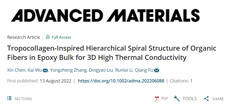 近日,8bo8足球比分live 吴凯副研究员/傅强教授在Advanced Materials(IF:32.086)期刊上发表了研究论文“Tropocollagen inspired hierarchical spiral structure of organic fibers in epoxy bulk for three-dimensional high thermal conductivity”,报道了一种受胶原蛋白螺旋结构启发的“环氧树脂/聚对苯撑苯并二恶唑纤维(PBO)块材”,这种全有机材料第一次在面外和面内方向同时实现了7 W/m K以上的高导热系数,在三维导热复合材料领域实现了新跨越,并利用理论模型进一步探讨了导热材料内部导热机理。8bo8足球比分 硕士研究生陈馨为论文第一作者;吴凯副研究员和傅强教授为论文通讯作者;第一作者单位为四川大学。