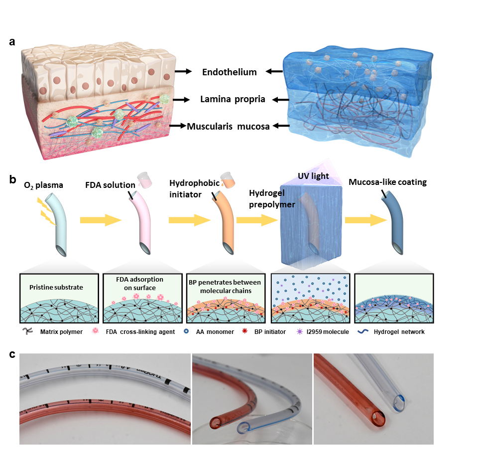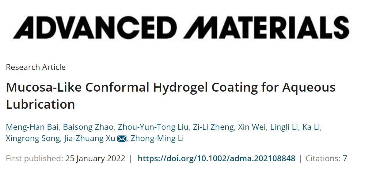 近日,8bo8足球比分live 徐家壮教授与广州市妇女儿童医疗中心合作,在国际期刊Advanced Materials(IF = 32.086)上发表研究论文Mucosa-Like Conformal Hydrogel Coating for Aqueous Lubrication。文章受黏膜功能和结构的启发,提出了在材料表面构筑仿黏膜水凝胶涂层的新方法,在临床中展现了优良的使用效果和转化潜力。8bo8足球比分live 硕士研究生白梦涵和广州市妇女儿童医疗中心赵柏松为论文共同第一作者;徐家壮教授为论文通讯作者;第一作者单位为四川大学。