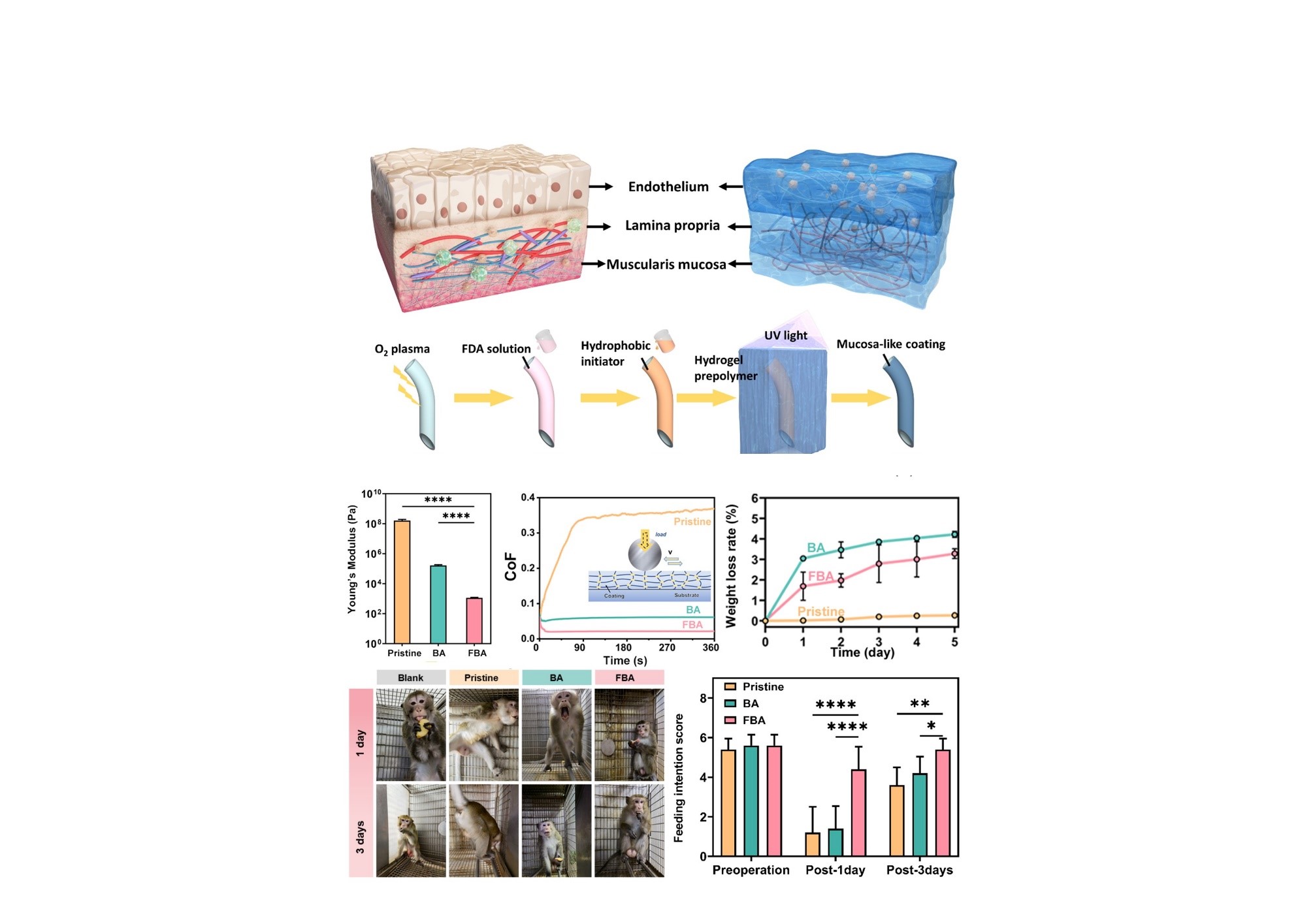 研究结果表明,仿黏膜涂层的厚度均一、具有强界面黏附性能、黏膜匹配的力学性能以及优异的润滑性能,并且能够在恶劣条件下保持稳定使用。体外的实验结果也证明了涂层具有很好的生物相容性和抗污能力。食蟹猴插管模型表明,仿黏膜涂层能够有效缓解插管带来的机体刺激、黏膜损伤、喉水肿、炎症等并发症,实验组的食蟹猴也能在拔管后迅速恢复进食意愿。进一步,通过临床手术患者盲法试验,证明了涂层在减轻气管插管相关喉气管损伤和术后喉咙疼痛方面的优良效果。该工作提出了一种构筑仿黏膜水凝胶涂层的新思路,能够改善临床中插管过程带来的并发症,具备良好的临床转化潜力。