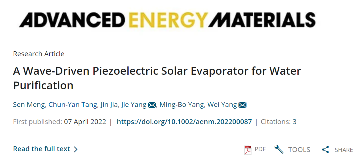 近日,8bo8足球比分live 杨伟教授和杨洁副研究员在Advanced Energy Materials (IF=29.69)上发表研究论文:A Wave-Driven Piezoelectric Solar Evaporator for Water Purification,提出了波浪能驱动的水蒸发活化策略,开发了一种自供能、连续化的高效太阳能蒸汽产生装置,实现了波浪能驱动的压电太阳能蒸发器用于水纯化的成果。8bo8足球比分live 博士研究生孟森为论文第一作者;杨洁副研究员和杨伟教授为论文通讯作者;四川大学为唯一完成单位。