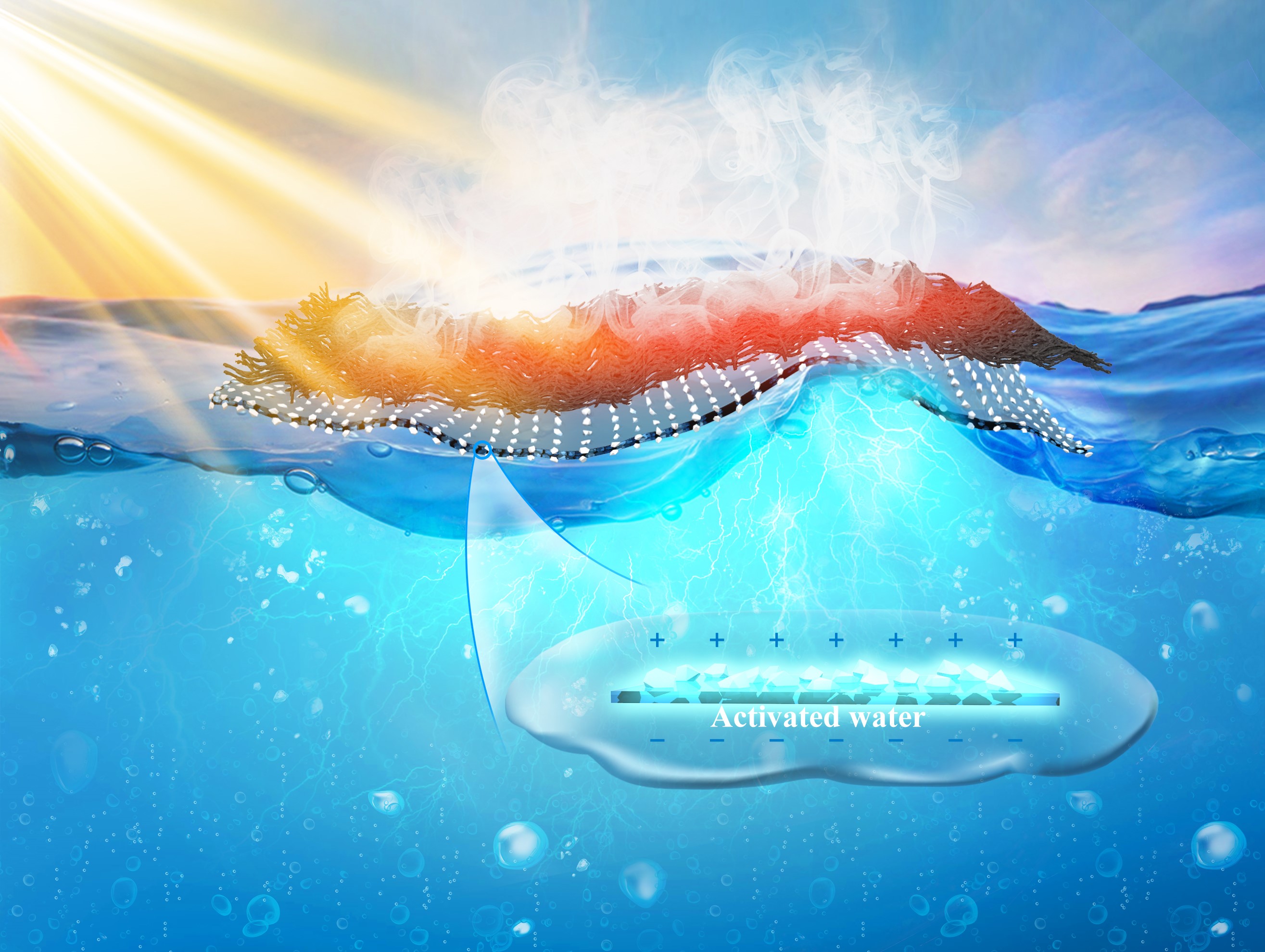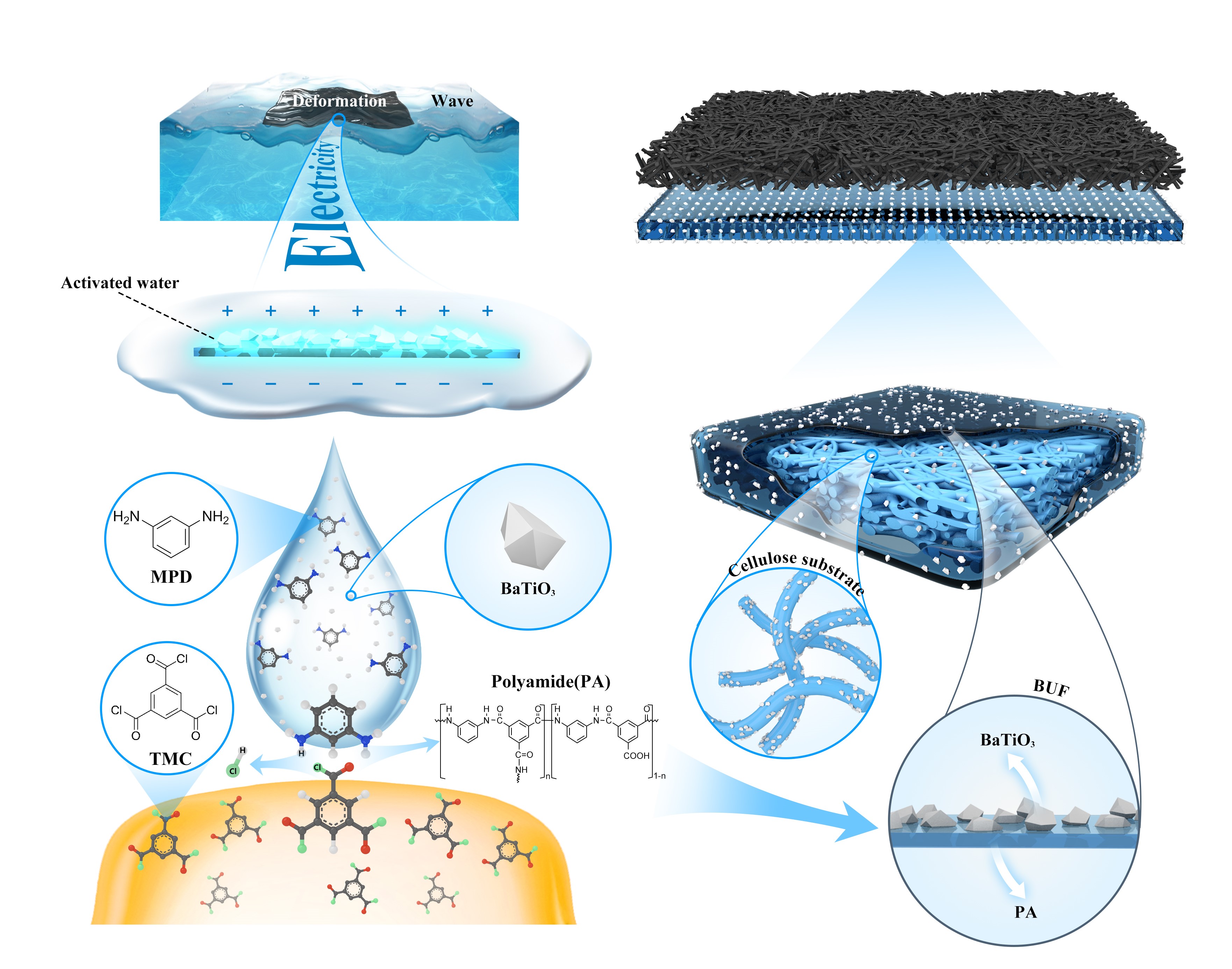 该论文开发了一种新的基于压电材料的水蒸发活化策略,实现了无需外部能源供应的连续的水活化过程。利用界面聚合的方式,制备了一种基于压电陶瓷钛酸钡纳米粒子的新型太阳能蒸发器,实现了波浪驱动的电能产生和电能诱导的水蒸发活化。钛酸钡粒子(直径200 nm)被嵌入在一层超薄的聚酰胺膜(80 nm)内,暴露在外部的纳米粒子可以充分与水接触。在这种半包埋的分布形式下,粒子暴露出来的部分可以高效地将波浪能转化为电能,活化附近的水分子,加速水的蒸发过程;此外,粒子被包埋进界面聚合层的部分增加其抗冲击能力,避免波浪冲击作用下的脱落。作者还采取了定性(原位红外)和定量(原位DSC和可控暗蒸发实验)测试表征技术及计算机模拟(分子动力学)对这种活化方式和机理进行了分析验证。在太阳能蒸发测试中,具有压电性能的蒸发器可以获得2.01 kg m-2h-1的蒸发速率;相比于不带有活化水功能的普通蒸发器而言,蒸发速率提高20%以上。此外,蒸发器还展现出优良的脱盐效果和污水纯化能力,经过纯化的水符合世界卫生组织(WTO)所制定的饮用水标准。本工作基于压电材料的设计,为太阳能界面蒸发中水的活化方式提供了全新的思路,也为高速率、低能耗、低成本的实际海洋环境的连续水蒸发提供了新的可能性。