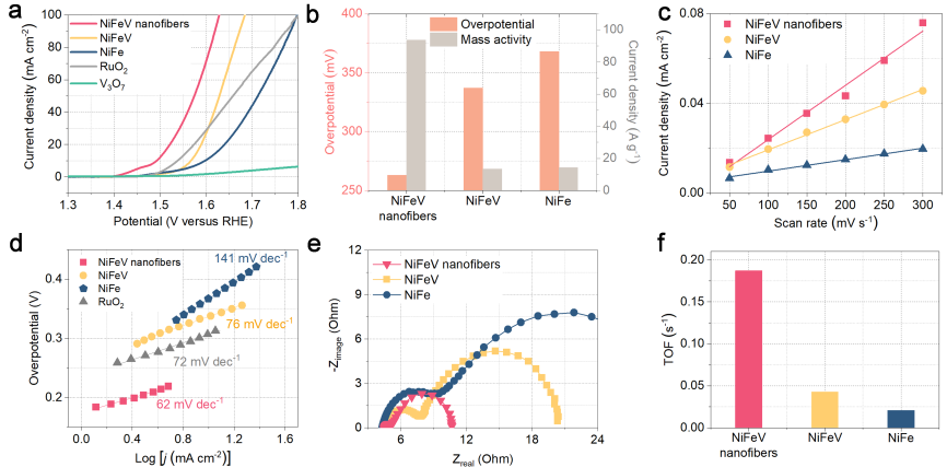在本研究中,研究人员首先制备了V3O7纳米纤维作为模板和V源。在NiFeV纳米纤维生长过程中,V3O7可以逐渐释放V原子,并逐渐替代掺杂到纳米纤维表层生长的NiFe氢氧化物中。电子结构分析表明,相对于“V原子一锅法”产物(NiFeV),界面V原子替代生长法的产物(NiFeV nanofibers)能更加有效地降低V结合能,NiFe结合能升高,NiFe (特别是Fe)向V的电荷转移使得催化剂中Fe处于高价态(>3+),说明界面V原子替代生长法更有利于NiFe活性位点价态调控。电化学测试结果表明,相比于NiFeV,NiFeV纳米纤维具有更低的过电位(η10=263 mV)、更快动力学(Tafel斜率:62 mV dec-1)、更好的本征活性(TOF值是NiFeV的4.3倍)、更好的导电性以及更大的电化学活性表面积。充分体现了利用界面V原子替代策略合成V掺杂NiFe氢氧化物对于OER性能提升的优越性。