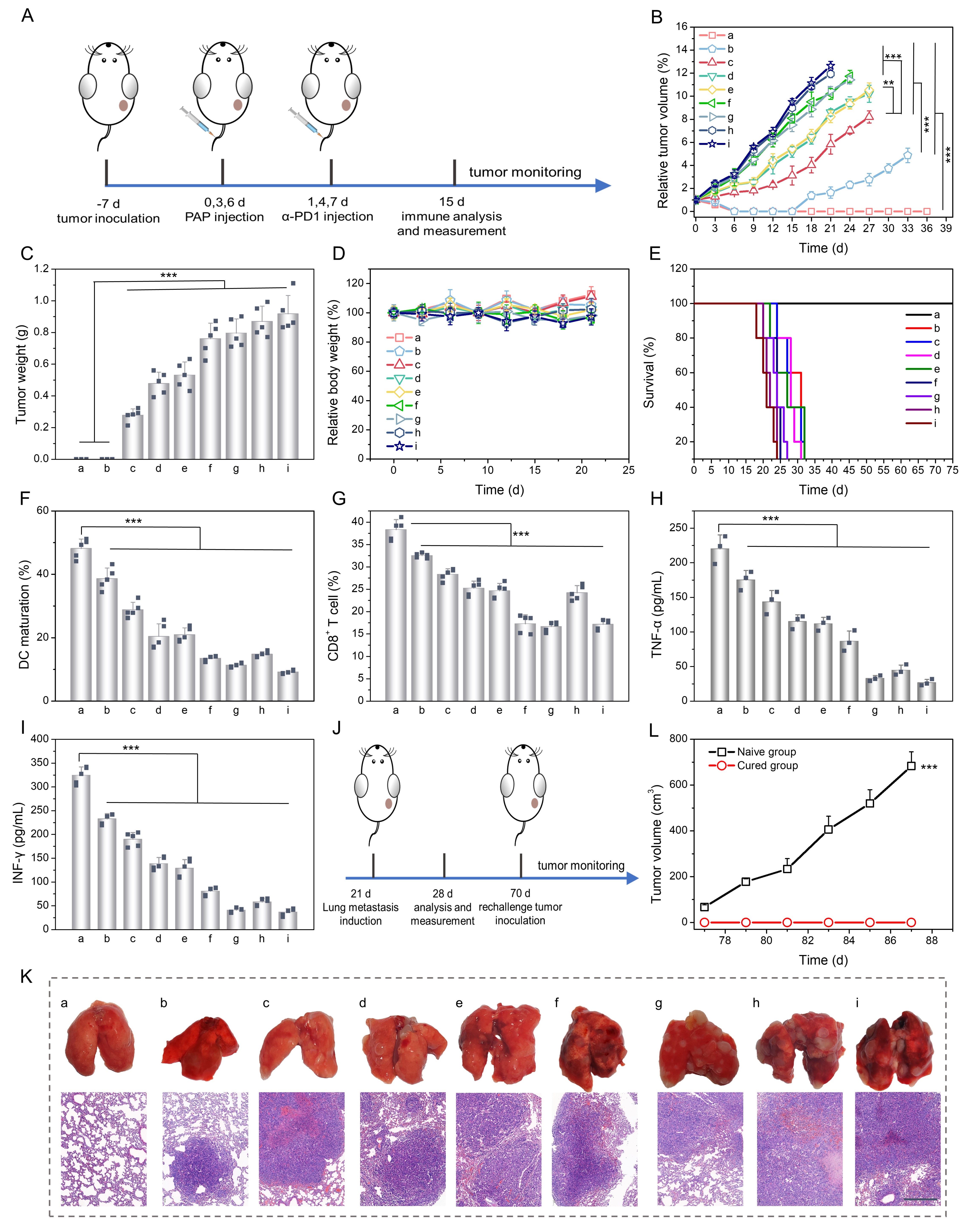 研究团队进一步将载有SRF和MEL的光控变构囊泡用于小鼠的肿瘤治疗,并与免疫阻断法相结合,成功激活小鼠体内免疫效应,重塑免疫微环境,在体内实现优异的协同抗肿瘤效果,清除了肿瘤,且有效抑制了肿瘤的转移和复发。该光控变构策略为高分子多级组装结构和功能调控以及智能响应药物递送系统的设计提供了新的思路,并且提供了一种具有构象功能开关的仿生纳米材料,在药物递送、疾病诊断和治疗方面具有巨大的应用潜力。