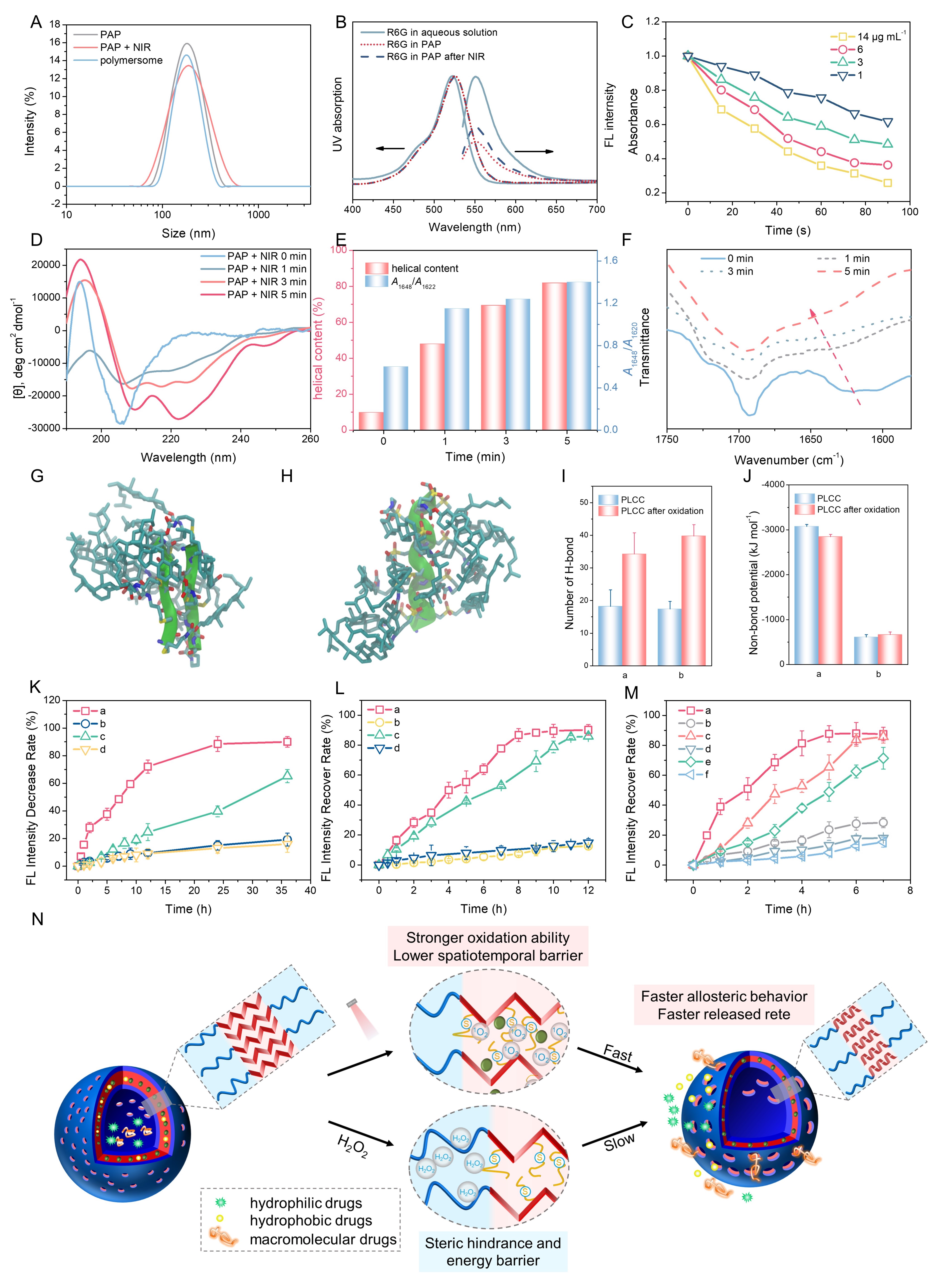 研究者通过将近红外光敏分子IR780与聚乙二醇-聚半胱氨酸结合,构建了光控变构囊泡。其在光照条件下能够在原位产生单线态氧,使聚合物构象在5min内从β折叠转变为α螺旋,作者通过分子动力学模拟揭示了聚氨基酸构象有序转变的分子机制。光响应变构行为在保证囊泡完整性的前提下提高了囊泡膜通透性,重构膜结构,从而促进不同分子量的亲水和疏水性药物的响应性释放,且释放速率明显高于氧化响应释放。