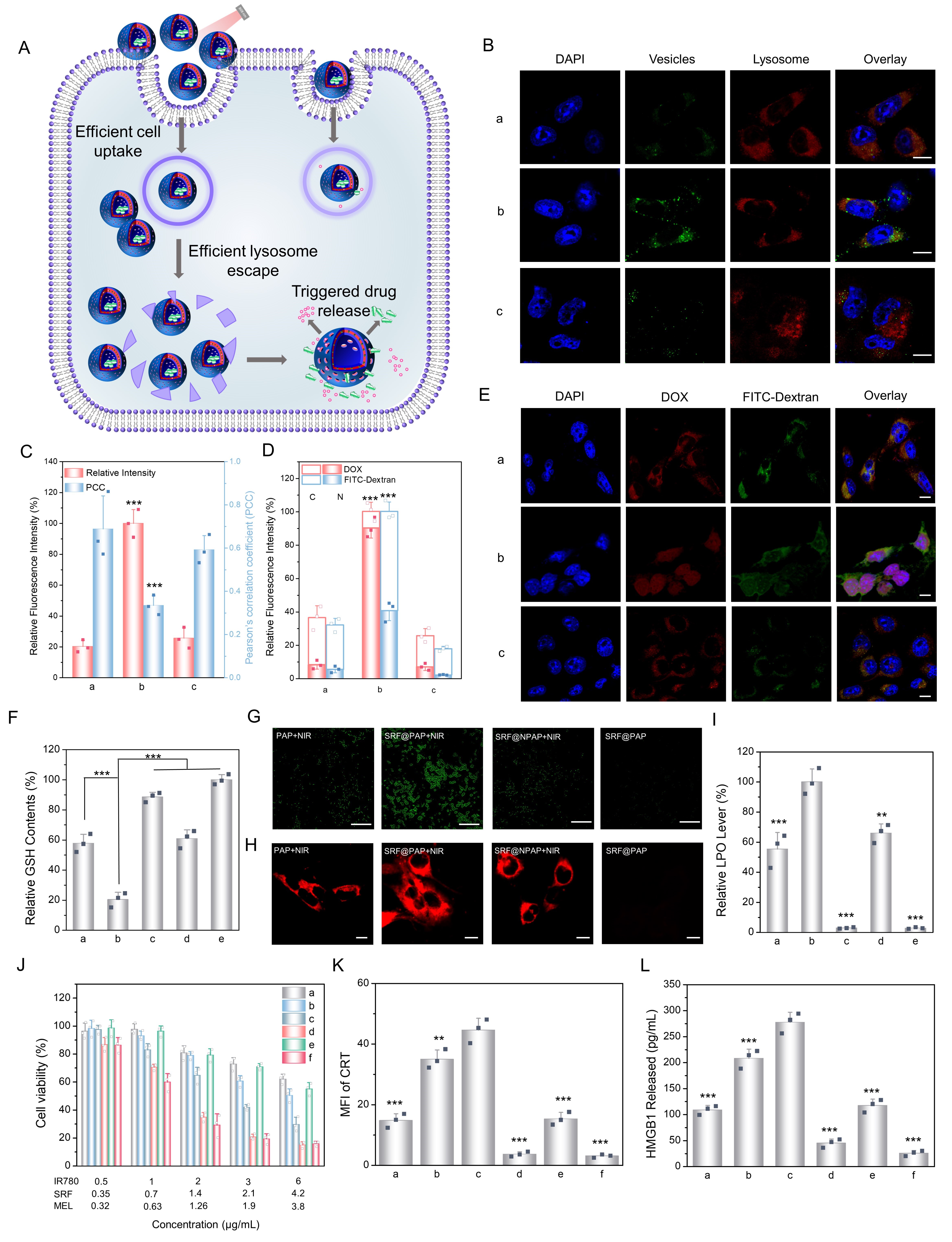 光控变构囊泡的超快构象转变增强了纳米载体的膜活性,使其具有优异的入胞及溶酶体逃逸能力,并实现GSH抑制剂索拉菲尼(SRF)和毒性多肽药物蜂毒肽(MEL)的高效递送,从而有效破坏细胞膜和提高胞内活性氧浓度,成功诱导免疫原性细胞死亡(ICD),表现出良好的肿瘤细胞杀伤效果。