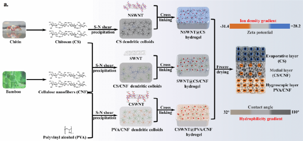 8bo8足球比分live 傅强教授团队利用湍流剪切沉淀、自组装和冷冻干燥等方法,设计了一种基于聚合物树枝状胶体和单壁碳纳米管(SWNT)的含有双重梯度结构的高性能、长持续时间的MEG。聚合物树枝状胶体及表面的单壁碳纳米管形成了仿生“核壳”结构,增强了水和单壁碳管之间的接触和相互作用。羧基化单壁碳纳米管和氨基化单壁碳纳米管在气凝胶内部构件了从-30.2到+27.6 mV的超高离子密度梯度,从而有效地驱动载流子的扩散并改善了MEGs的最大输出功率。同时,利用不同聚合物树枝状胶体,研究团队在气凝胶内部构建了具有不同亲疏水性能的亲水性梯度,显著改善了水和载流子的持续传输能力,保障了MEGs能够在高湿环境下稳定持续供能。通过上述设计,该气凝胶基MEGs实现了约32.59 μW·cm-2实际功率和超过120 h的输出时间,有望兼顾高功率和长持续时间,为新型高性能MEGs的开发提供了一种新思路。该MEGs在湿气发电领域在能量密度和功率密度方面都实现了领先。该工作以“Double gradient structured composite aerogels for ultrahigh performance moisture energy harvesting”发表在《Energy & Environmental Science》上。文章的第一作者是博士研究生张学忠,通讯作者为邓华教授和傅强教授,该研究得到国家自然科学基金委的支持。