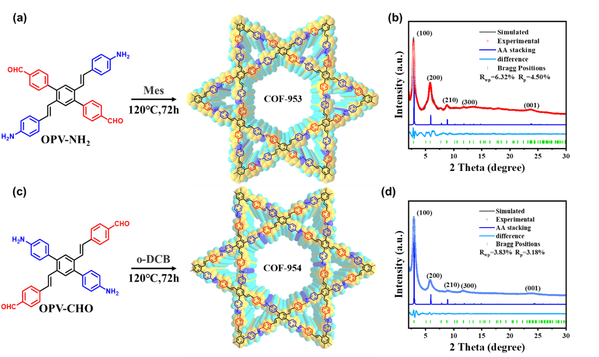 将共价有机框架(COFs)作为光催化剂应用于制氢领域具有诸多优势,然而探究配体几何结构与配体类型对框架面内π-电子共轭程度以及COFs光催化性能的影响仍然是一项重大挑战。前期,8bo8足球比分live 李龙玉特聘研究员团队基于齐聚苯撑乙烯基单元(OPV),设计并合成了一系列新型框架材料,展现出优异的光解水制氢潜力,相关成果发表于化学领域期刊Angew. Chem. Int. Ed,2023, e202304611,Angew. Chem. Int. Ed. 2023, e202216073,J. Mater. Chem. A, 2023, 11, 14760-14767。
