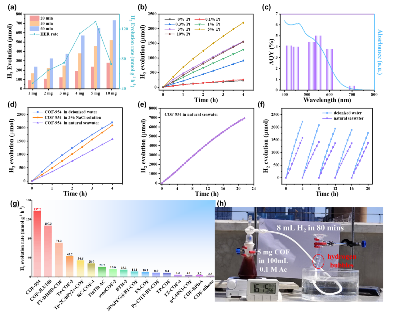 图 4:不同条件下的COF-954的产氢速率、表观量子效率测试、长循环测试、性能对比图以及排水法实验照片