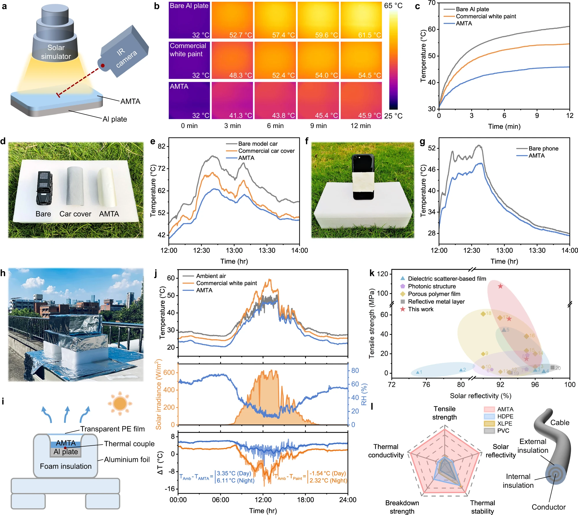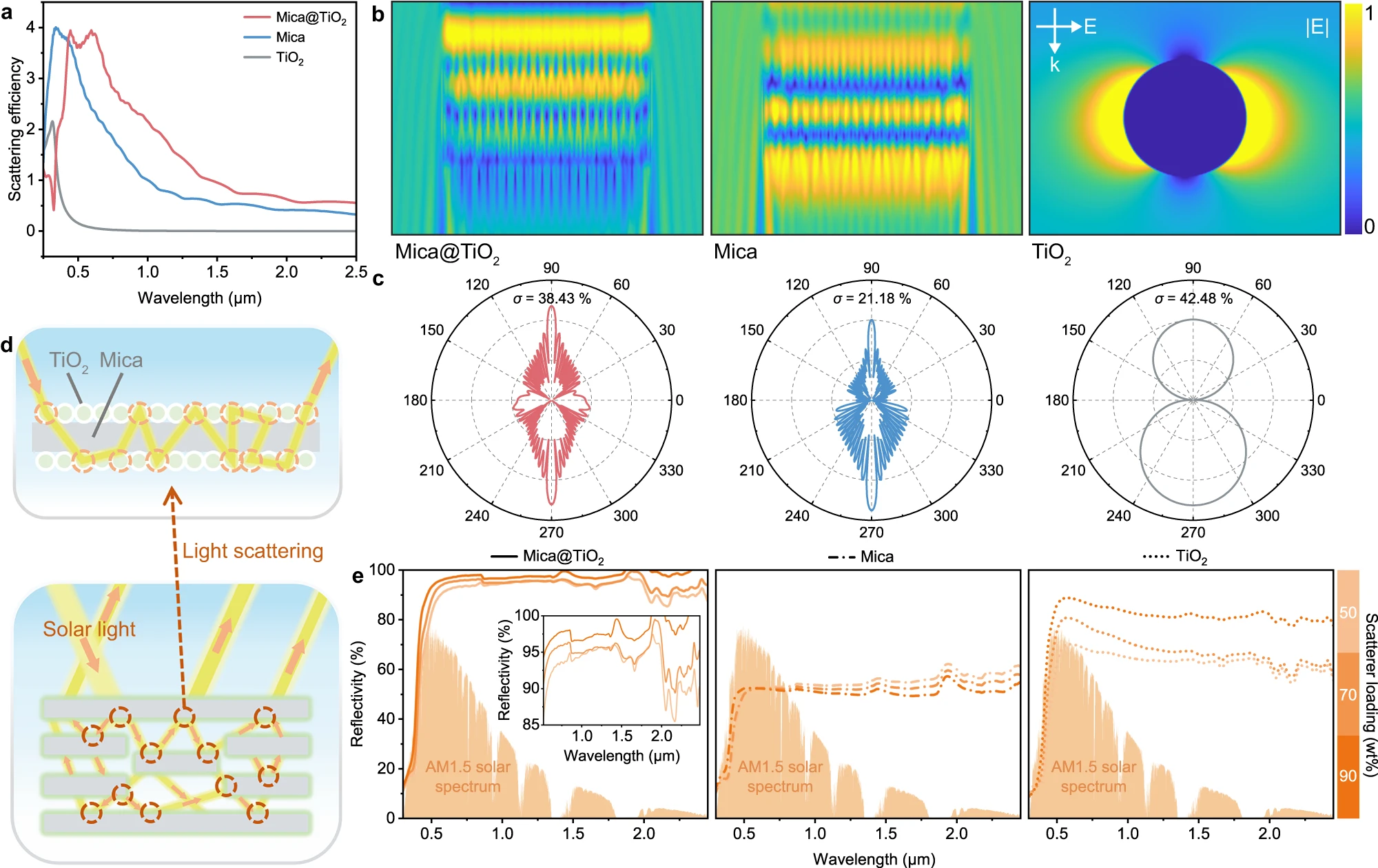 近日,8bo8足球比分live 傅强/邓华教授团队利用“溶剂交换-二次质子化”策略,构筑了一种基于芳纶纳米纤维(ANFs)树枝状胶体和云母/二氧化钛(Mica@TiO2)核壳散射体的层状PDRC薄膜(AMTA)。通过对ANFs多步质子化过程的精确调控,其呈现出高度支化的三维网络结构,可稳定负载高含量的片状Mica@TiO2核壳散射体,并快速诱导层状结构成型,赋予其超过100 MPa的力学强度。与此同时,核壳散射体在光学模拟中也呈现出更强的散射效率因子,尤其是背向散射,它连同其它折射率差异界面处的散射行为(如孔隙界面)共同促进了PDRC材料的太阳光反射率(>90%),并在实际户外制冷测试中实现日间降温3-4℃,夜晚降温6-7℃。此外,依赖于各组分本征的优异性质,该设计还集成了绝缘、紫外耐候、耐高温、耐刮擦等综合实用性能,有望进一步应用于车衣、手机、电缆热管理防护等领域,为PDRC技术在户外场景中的持久服役提供了潜在可能。该工作以“Thin lamellar films with enhanced mechanical properties for durable radiative cooling”为题发表在Nature Communications上(Nat. Commun. 2023, 14, 6129)。文章第一作者是四川大学硕士研究生熊联虎。该研究得到国家科学技术部(重点研发计划)的资金支持。