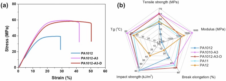 图 3 . 络合改性和解络合处理对PA1012烧结制件力学性能的影响及其与PA12、PA11制件性能的对比