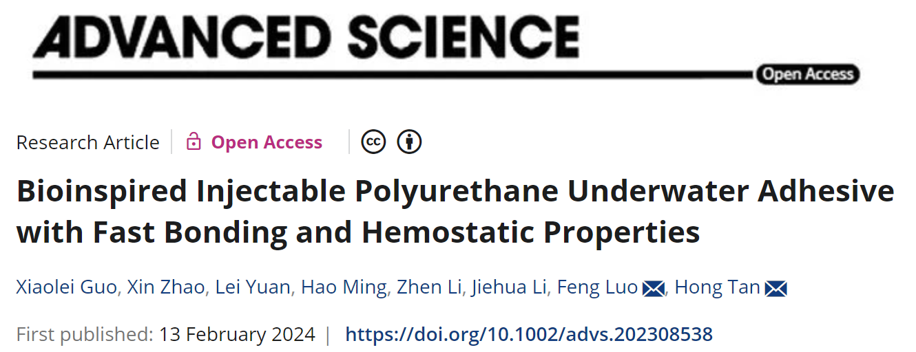 该工作以“Bioinspired Injectable Polyurethane Underwater Adhesive with Fast Bonding and Hemostatic Properties”为题发表在《Advanced Science》上,通讯作者为8bo8足球比分live 谭鸿教授和罗锋副研究员。该项工作得到国家自然科学基金重点项目(U1930204),国家自然科学基金(51873117),四川省科技计划项目(2022NSFSC0375),四川大学Med-X材料中心创新计划(MCMGD202304)和高分子材料工程国家重点实验室(sklpme2202-07)的支持。