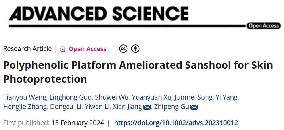 基于以上研究背景,8bo8足球比分live 李乙文/顾志鹏团队与华西医院皮肤性病科蒋献主任合作,提出了一种利用多酚/聚多酚材料改善山椒素稳定性的策略。通过合理的化学修饰与设计,山椒素可以与一系列天然多酚分子通过超分子相互作用形成纳米功能材料,实现了稳定性的大幅提升,从而在紫外防护与氧化防护功能的传递得到了巨大的改善。对比于单纯的山椒素分子,所构筑的功能材料在皮肤光损伤细胞模型和动物模型中展现了显著提升的保护效果。相关研究工作以Polyphenolic platform ameliorated sanshool for skin photoprotection为题在Advanced Science杂志上发表。