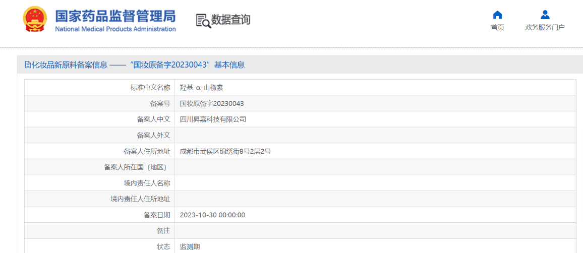 相关报告表明,山椒素分子在FDA、中国国家药品监督管理局的目录库中并没有以纯净的化合物形式出现,而是以花椒果提取物的混合物形式存在,其根本原因是山椒素提取之后稳定差,难以适应在皮肤疾病治疗等过程中的重复性功效需求。而团队之前的研究刚好解决了这一瓶颈问题,让纯净的山椒素分子申报新原料成为可能。在团队及相关合作公司的努力下,山椒素在2023年成功通过国家药品监督管理局新原料备案(国妆原备字20230043),成为了自21年国家药监局新规实施后,四川省注册备案人首个成功备案的本土新原料,填补了四川本土原料应用于化妆品领域的空白(图4)。山椒素也与贝泰妮的水龙提取物,美肤宝的人参皂苷等一起成功入选2023年度新妆大赏创新原料。山椒素目前已经作为核心功能原料用于市面上多款保湿防光修护产品的设计,受到了消费者的广泛认可,累积产值已超亿元。