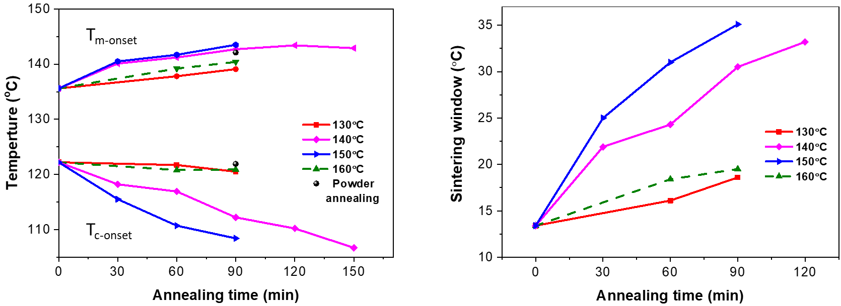 图 2 共混物退火对PP粉末起始熔融温度(Tm-onset)、起始结晶温度(Tc-onset)和烧结窗口的影响。